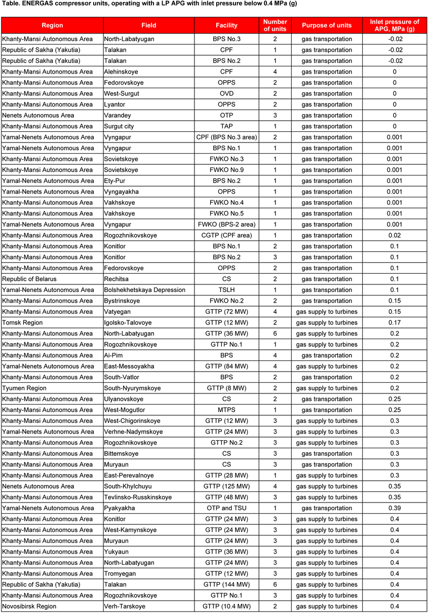 At present, 122 of our compressor units (see table below) are used in operation with low-pressure associated gas (inlet pressure range -0.02 ... 0.4 MPa g). Among them, 57 units operate at gas gathering and transportation facilities, and 65 treat LP APG as fuel for autonomous power supply complexes of the fields.