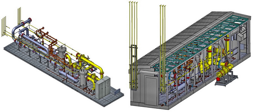 To achieve design gas temperature (up to +40°C), at the GRS there is installed heating module, which composed of heat exchangers and subassembly of gas condensate gathering and storage with a drainage tank.
