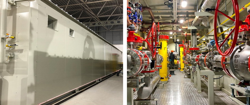 The gas receiving station is placed in a separate all-weather module (block-box) and is equipped with necessary engineering systems, including life support systems (heating, ventilation and lighting) and safety (fire detection, gas detection, alarm and fire fighting).