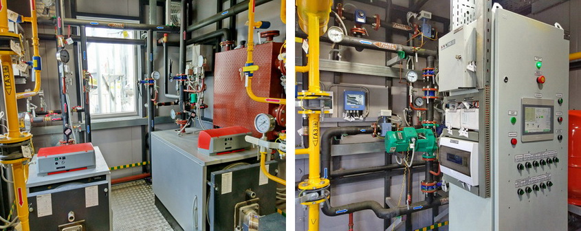 The boiler room is placed in a separate compartment docked with the main enclosure of the facility. It is equipped with engineering systems and its own fuel supply unit with devices for filtering, pressure reducing and metering of gas. The operation of the boiler room is fully automated, boilers automation and common local control system of PBR are integrated with the ACS of FGTF.